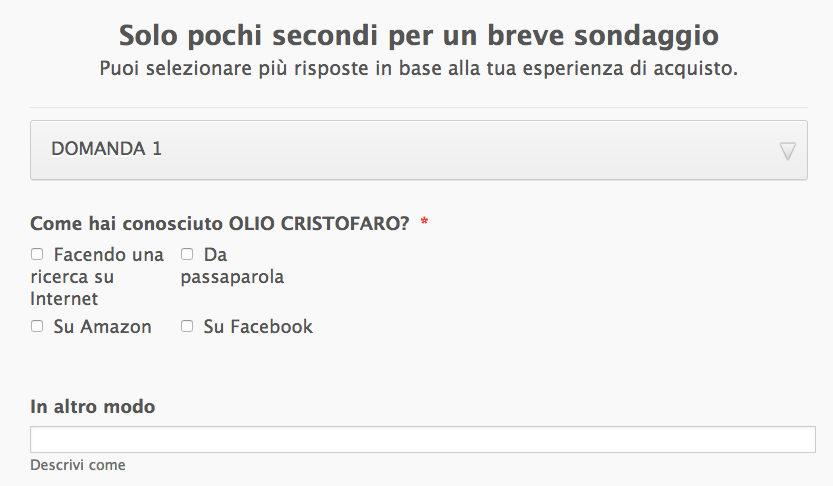 La scoperta può avvenire su Facebook, su Amazon o da passaparola. Ed ecco che un modo per approfondire il processo di acquisto dei clienti è chiederlo ai clienti. Lo scopo del sondaggio è proprio questo. Capire.